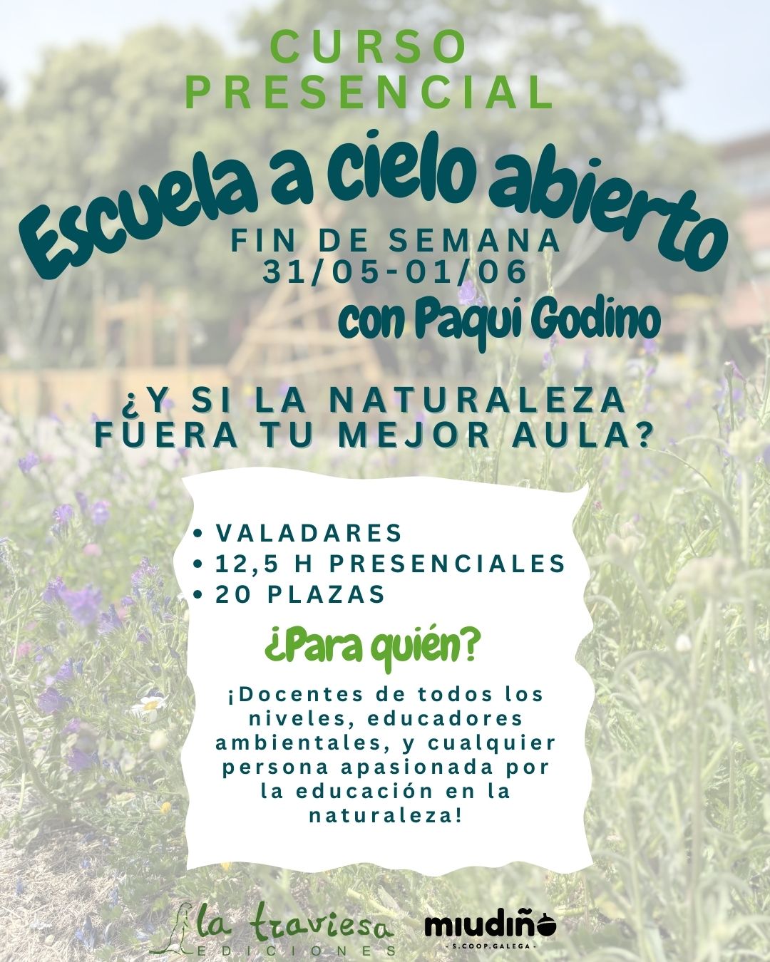 Te invitamos al curso presencial, «Escuela a Cielo Abierto. Herramientas didácticas para naturalizar el currículo y fomentar el vínculo con la naturaleza », que organizamos conjuntamente Miudiño S. Coop. Galega y La Traviesa Ediciones. Este curso será impartido por Paqui Godino, el fin de semana del 31 de mayo y 1 de junio, en la acogedora Asociación de vecinos de Valadares (Vigo) y su precioso entorno. ¡Te esperamos!